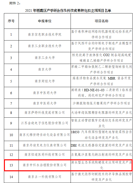 近日,我司科研項(xiàng)目《清水型生態(tài)系統(tǒng)構(gòu)建技術(shù)應(yīng)用研發(fā)及產(chǎn)業(yè)化》成功申報(bào)2021年棲霞區(qū)科技成果轉(zhuǎn)化項(xiàng)目。這是公司在科研方面的持續(xù)投入及創(chuàng)新能力的不斷提升,也是對(duì)公司研發(fā)實(shí)力的肯定。